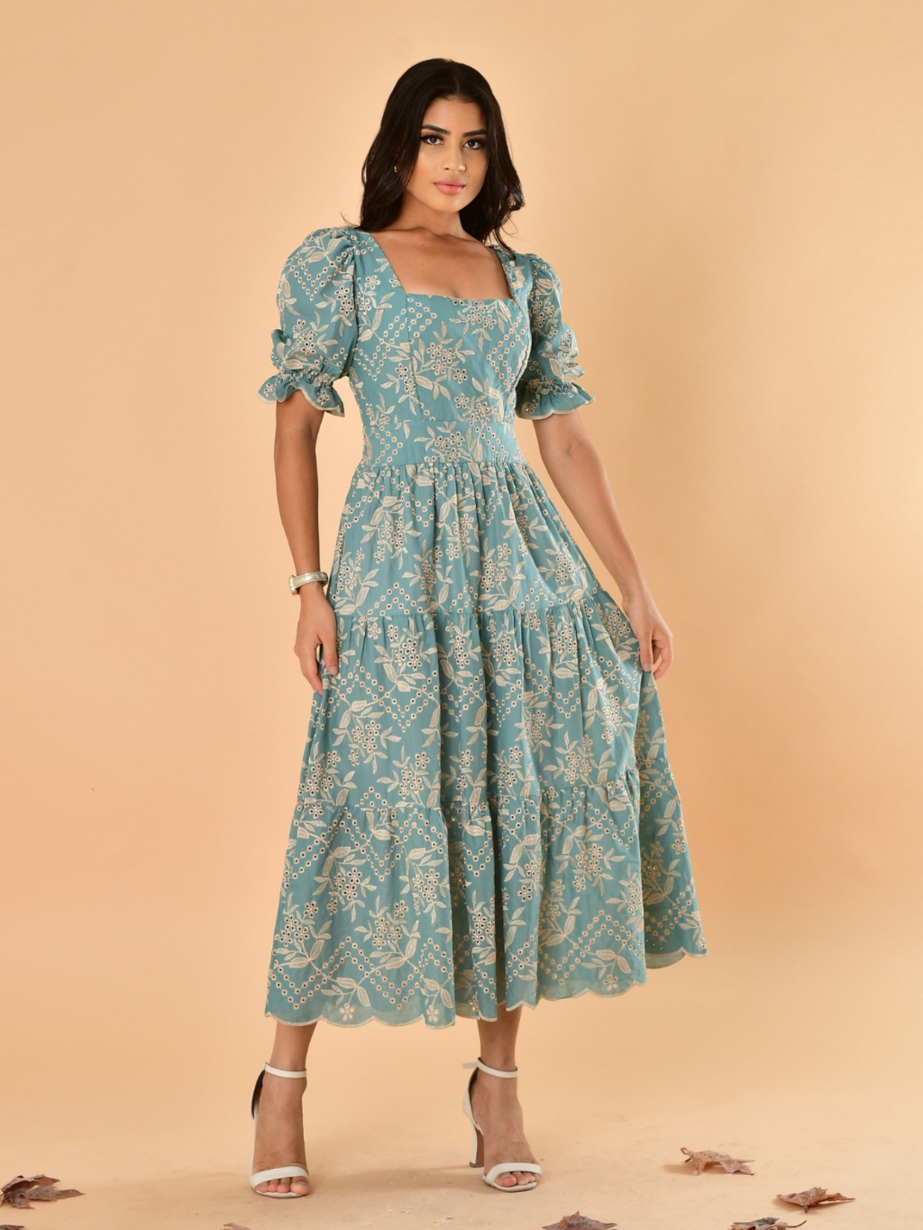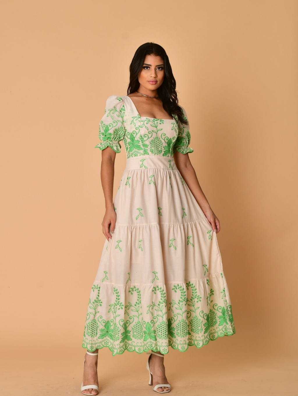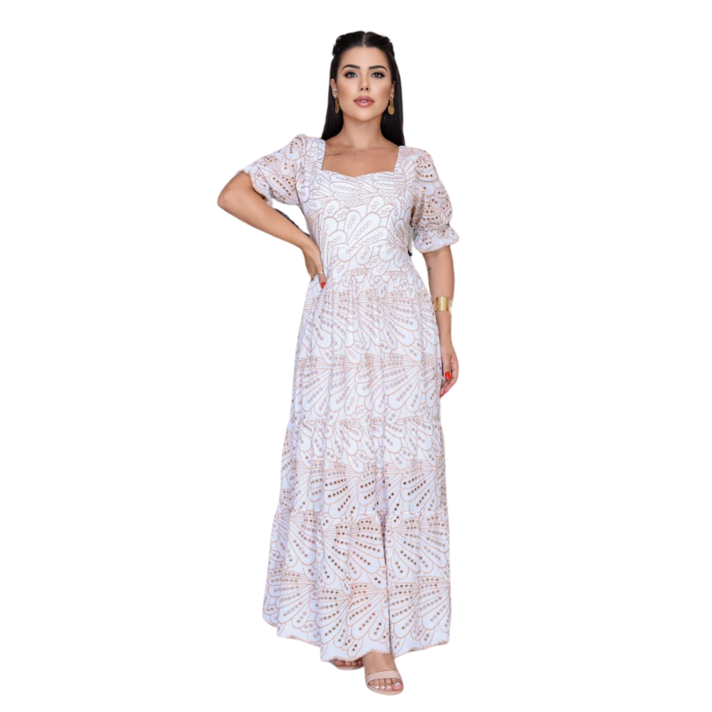 Vestido Lasie Nude Bordado 100% Algodão Longo Casual Luxo Romantico Moda Cristã Evangelica Tres Marias Manga Princesa Lancamento