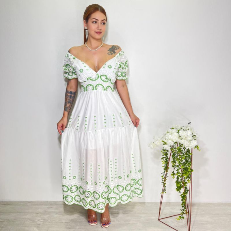 vestido longo luxo lese bordado algodão gola V manga curto