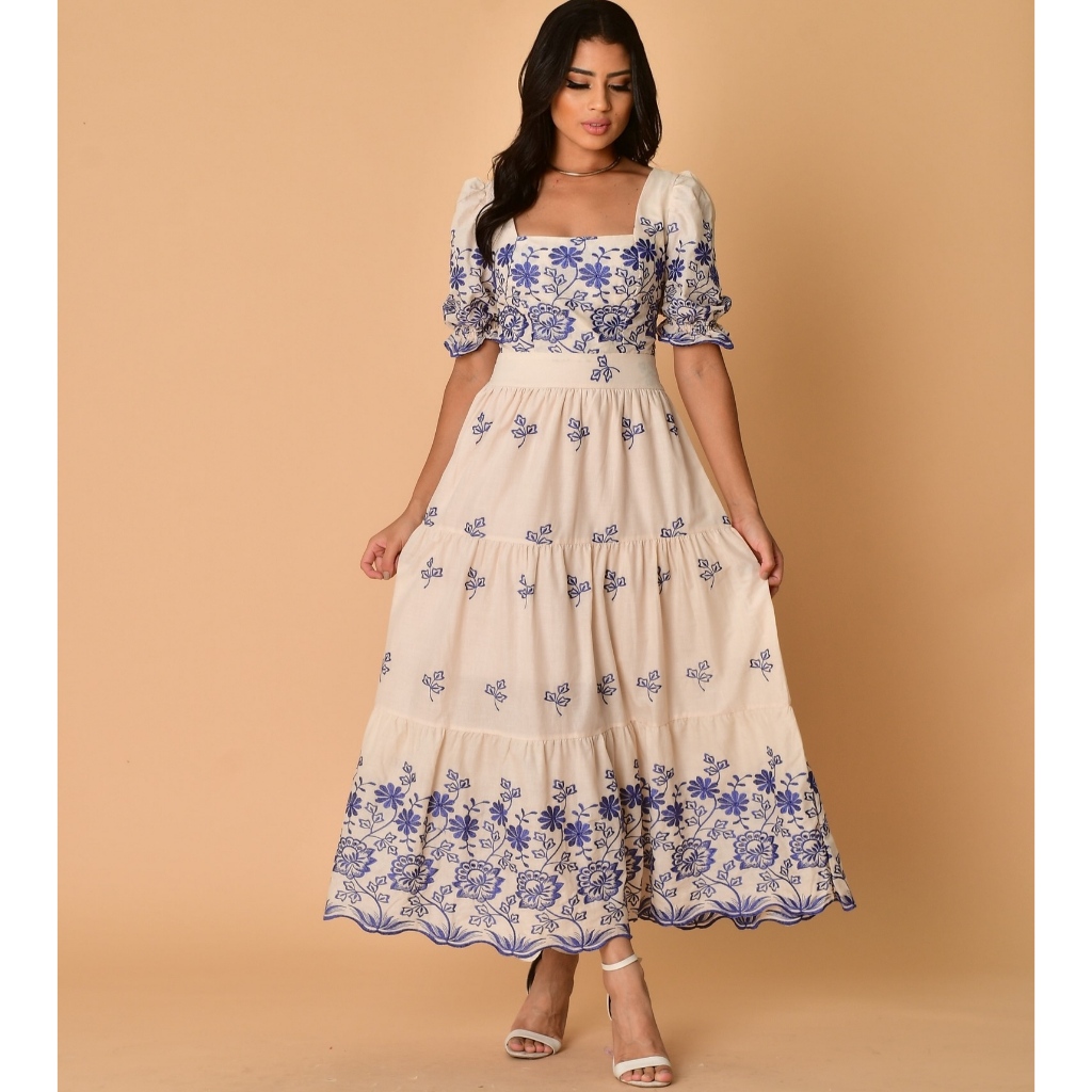 Vestido Longo Indiano Bordado 100% Algodão Cianinha Com Elastano