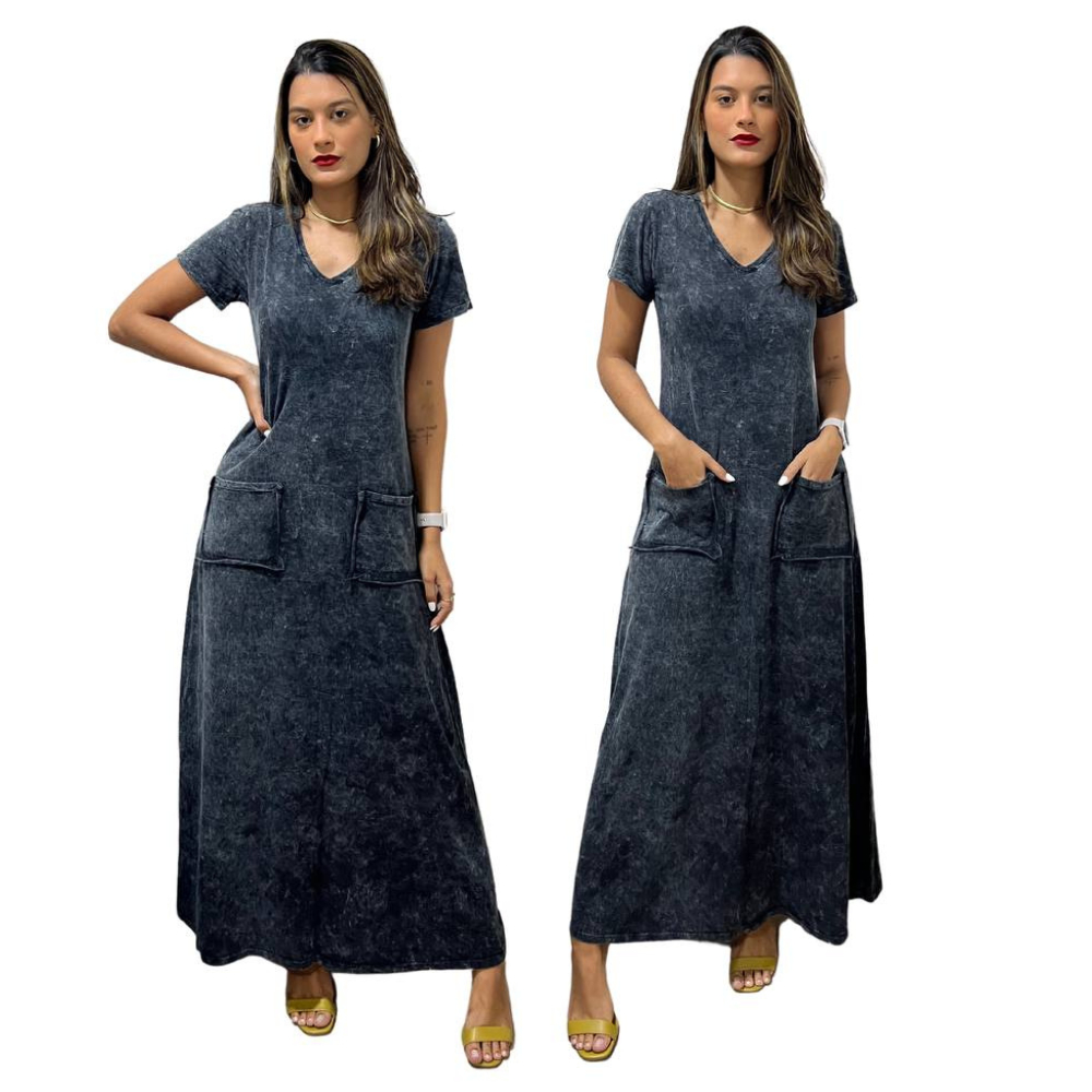 Vestido Longo Gola V Com Bolso Frontal Em Malha Estonada 100% Algodão