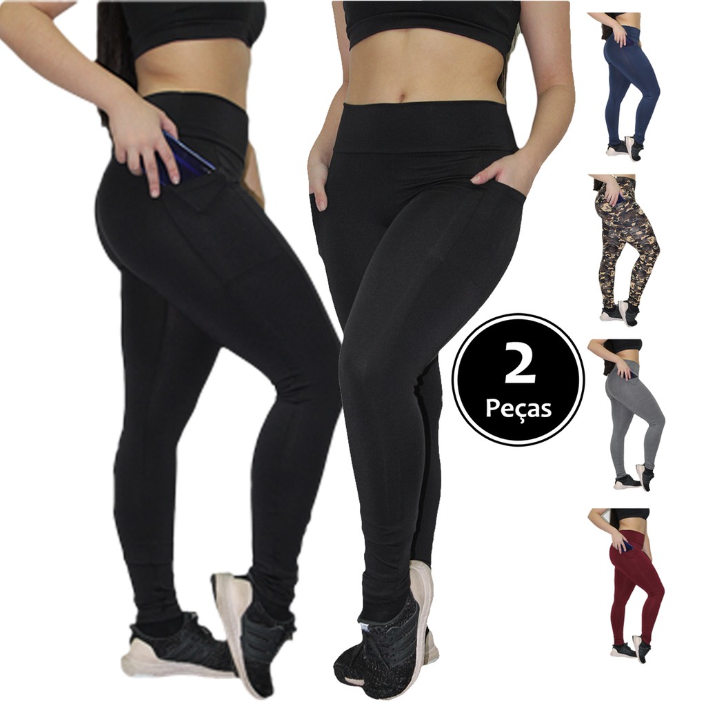 Kit 02 Calça Legging suplex Feminina Bolso celular Fitness Roupa Academia cós alto