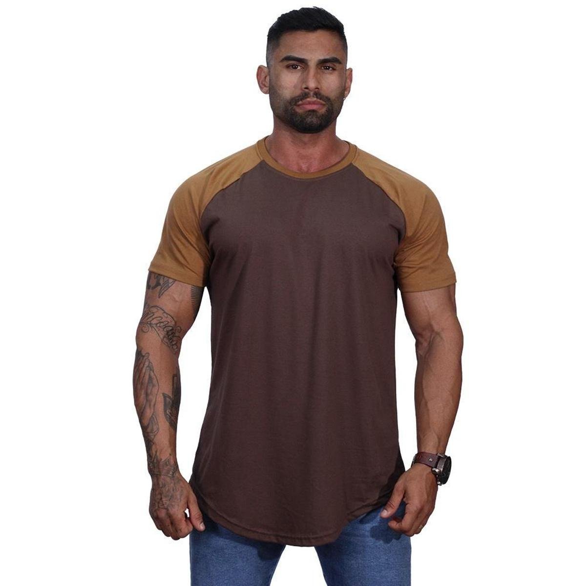 Camiseta Longline Manga Curta MXD Fitness Sem Estampa Fitness Básica Bicolor e Raglan Dia-a-Dia