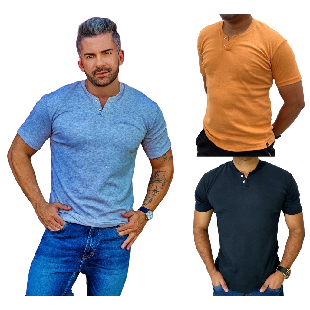Camiseta Henley Masculina Slim Fit MCurta 2 Botões - 5 Cores para sua Escolha