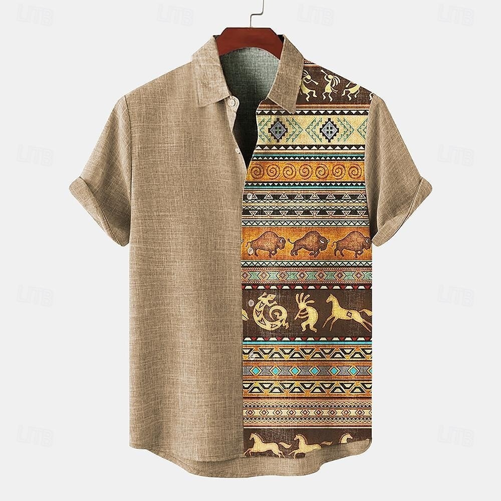 2025 Retro Masculino Étnico Impresso Floral Camisa De Manga Curta Solta Casual Plus Size Vintage Lapela Botão Up Polo