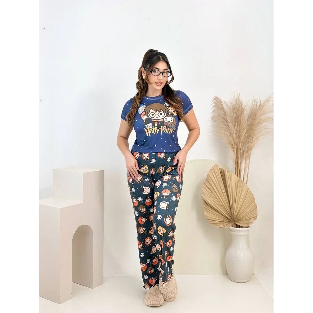 Pijama Baby Doll Calça Manga Curta Personagens HP Turma Azul