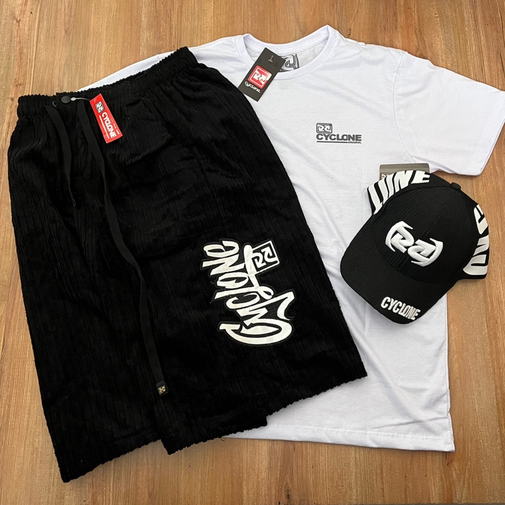 Kit Bermuda Da Cyclone Veludo Preta Mandraka Show + Camiseta Algodão Branca e Boné Quebras