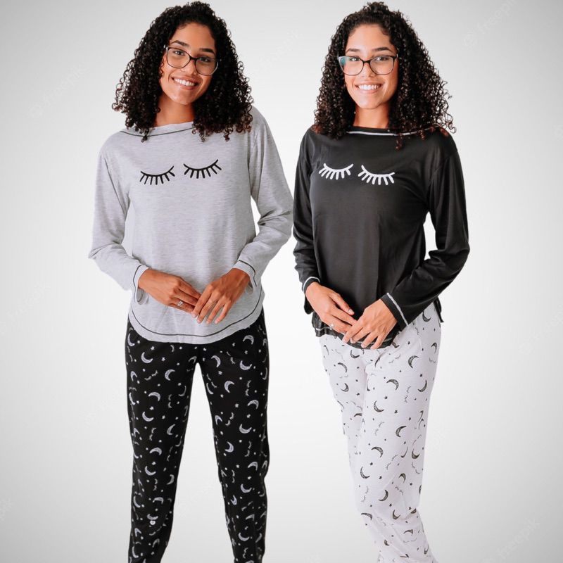 Pijama Longo Feminino Cílios Olhinho Sleep Conjunto de Frio Personagem Roupa de Dormir Barato Calça Blusa Manga Estampado
