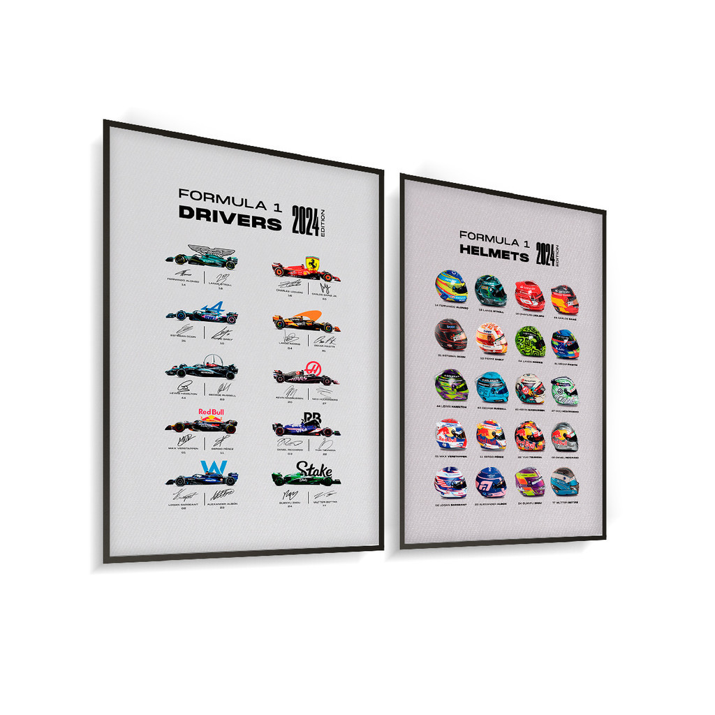 Kit 2 Quadros Sem ou Com Moldura Fórmula 1 F1 Pilotos Drivers Equipes Carros e Capacetes 2024
