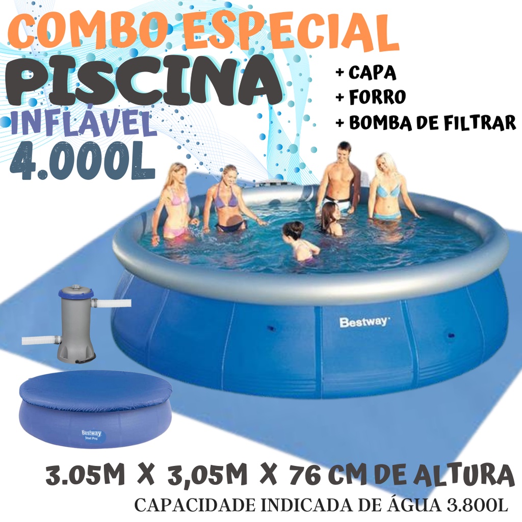 Piscina Combo Especial - Piscina 4000 Litros - Acompanha Capa, Forro e Bomba de Filtragem 127V - Piscina Inflável Redonda 3,05m x 3.05m x 76cm,