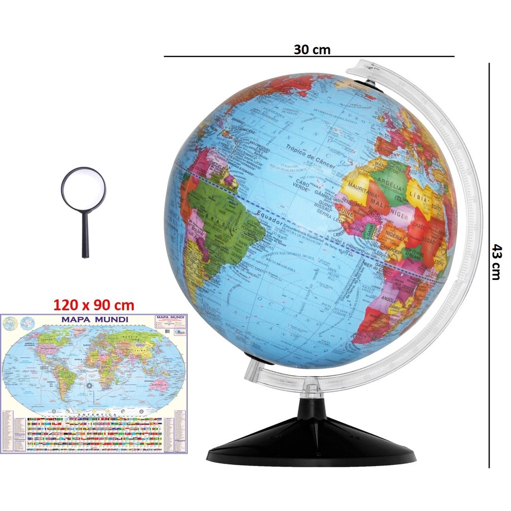 Globo Terrestre Político Studio 30cm Diâmetro e 43cm Altura + Mapa Mundi Gigante + Lupa