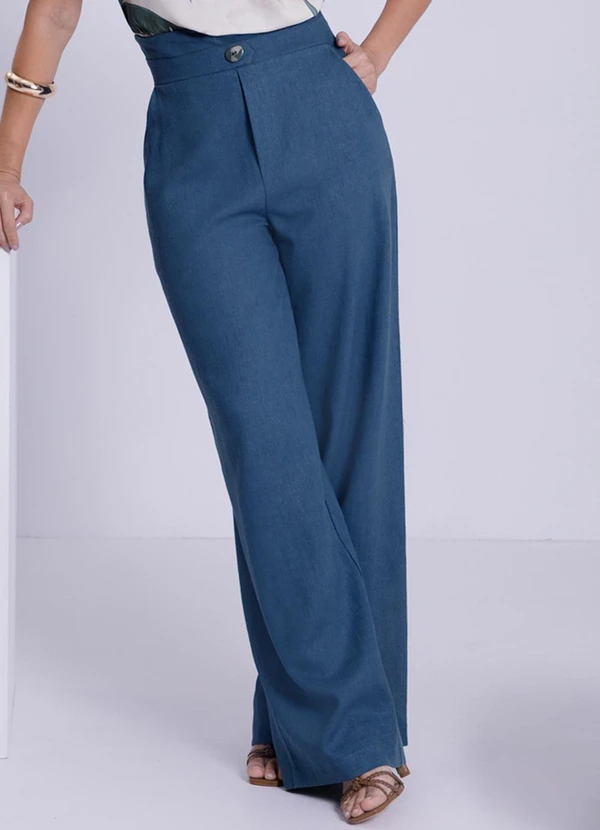 Lunender - Calça Pantalona em Linho com Detalhe Cós Azul