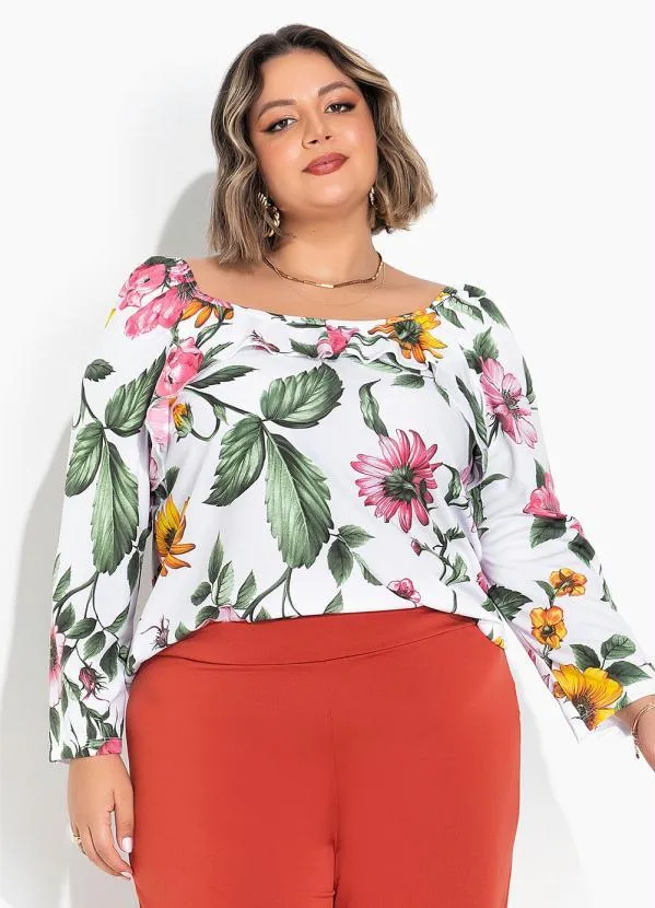 Marguerite - Blusa Floral Branca Babado no Decote Plus Size