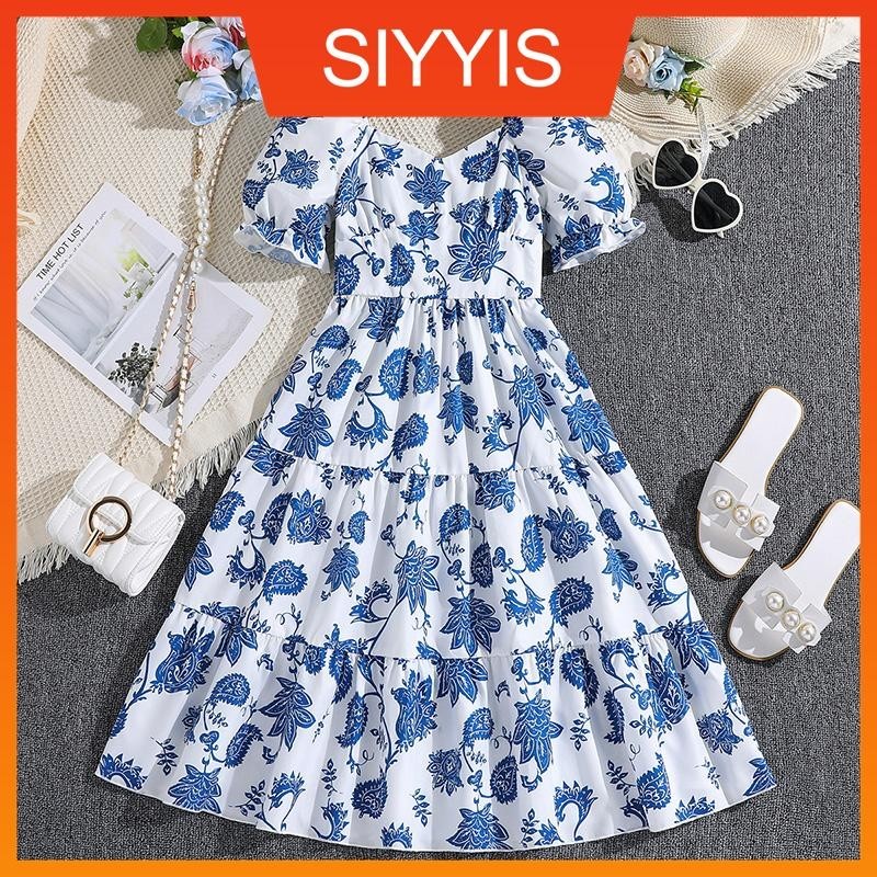 Crianças Verão 8-12 anos de idade Meninas Azul Impresso de manga curta Puff Sleeve Dress Holiday Party Estilo Coreano Temperamento Diário Casual Solto Vestido Confortável