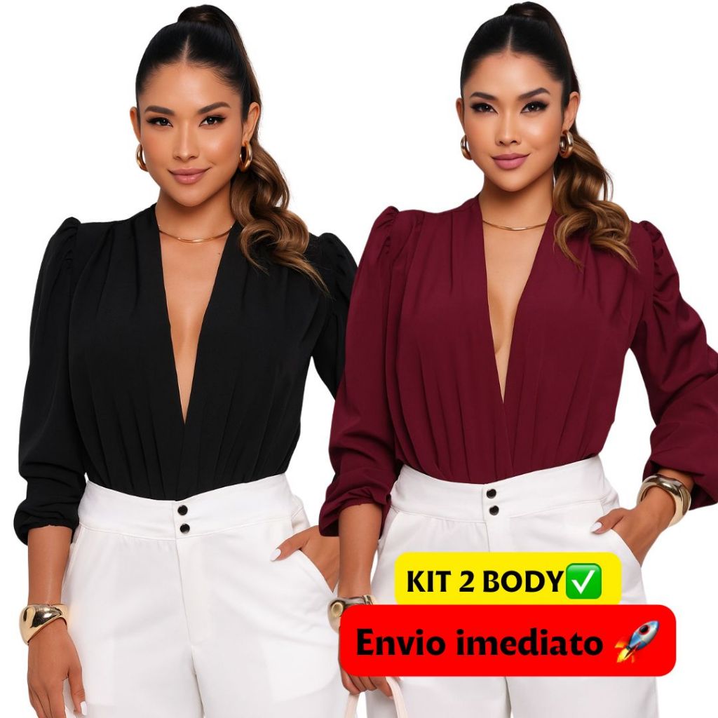Kit 2 Body transpassado manga longa trabalho casual decote tendência blogueira elegante boho chic