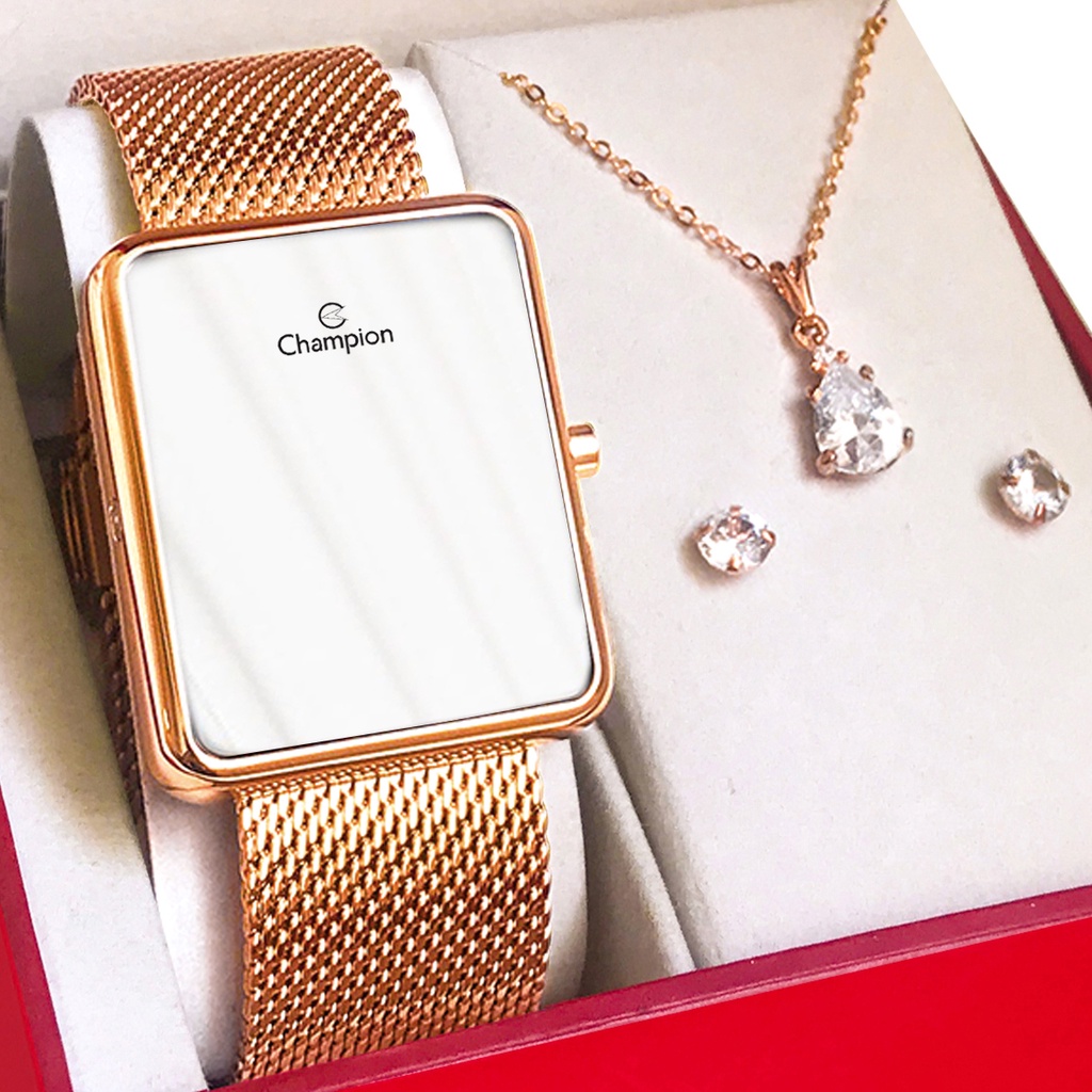 Relógio Champion Feminino Dourado Prova d'água com 1 ano de garantia com colar e brincos