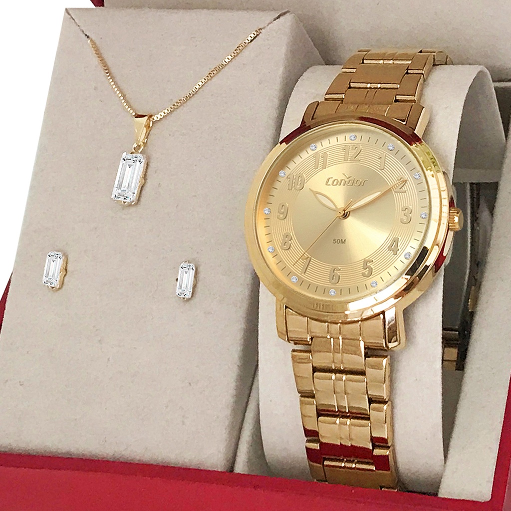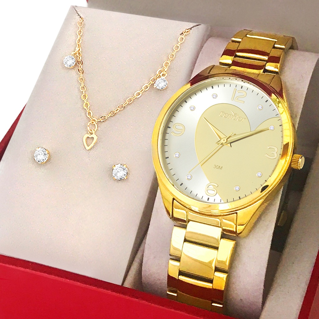 Relógio Condor Feminino Dourado Prova d'água com 1 ano de garantia e conjunto