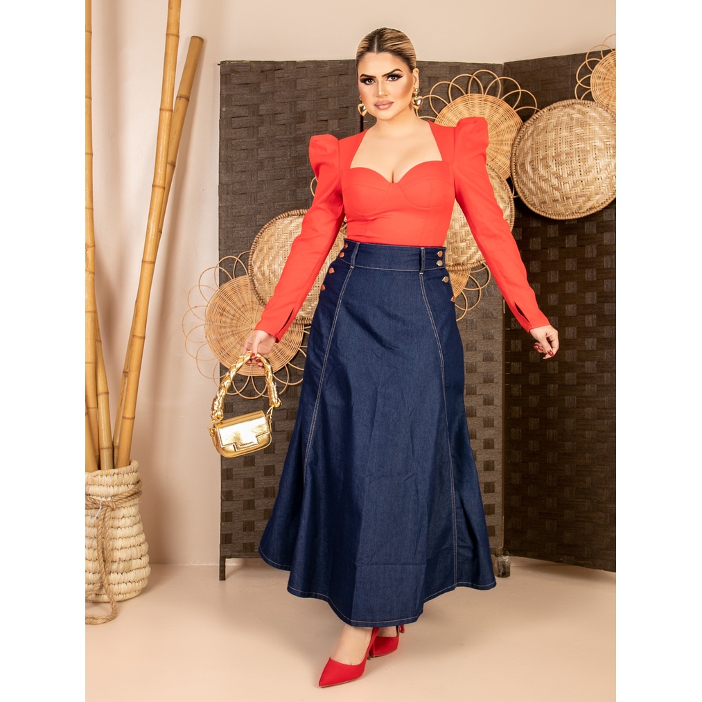 Saia Longa Jeans Rodada Godê Cintura Alta Moda Evangelica