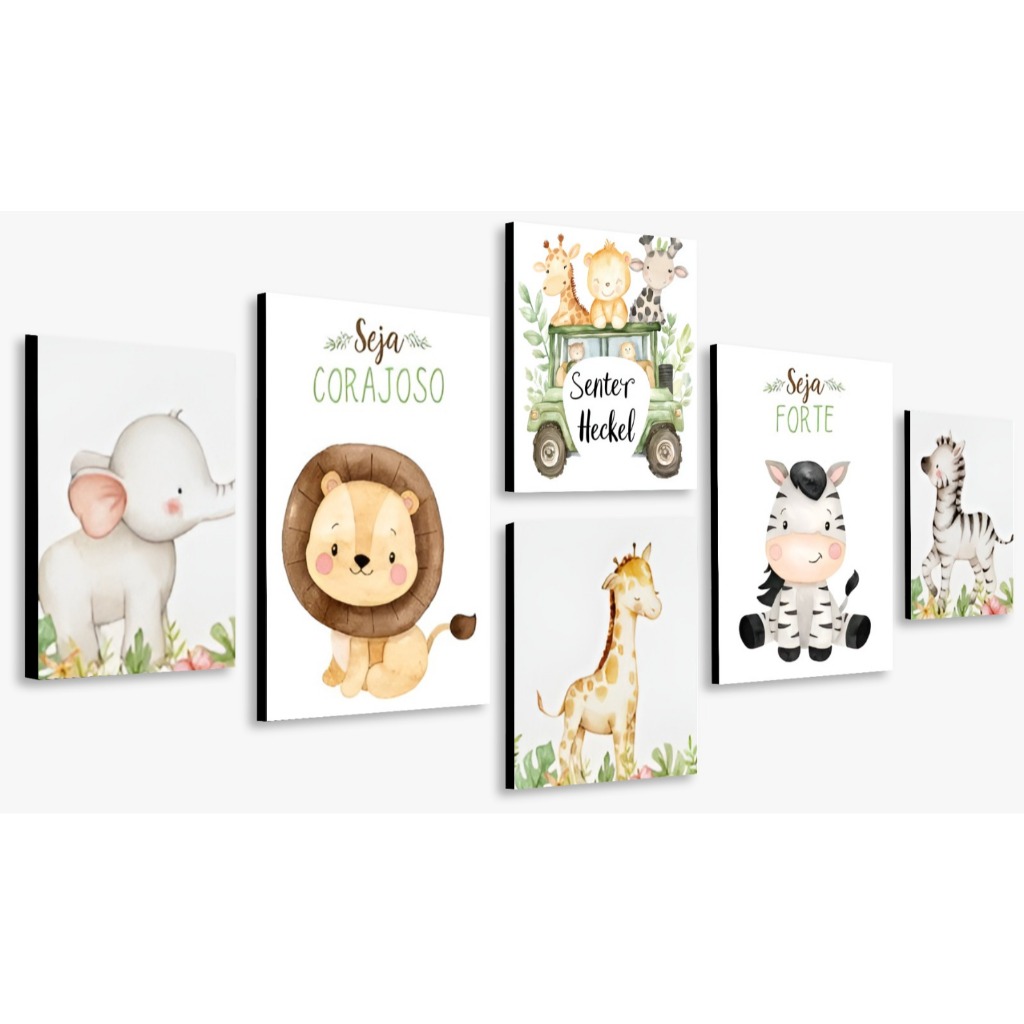 Kit Quadro 6 Peças Safari Decorativo Parede Verde Decoração Leão Infantil Girafa Frases Quarto Mdf Zebra Animal Bohe