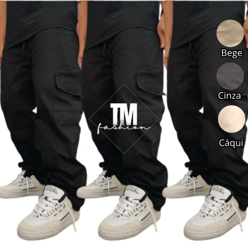 3 Calça Cargo Larga Unissex 6 Bolsos Esportiva Lisa Skatista Sarja Calça Masculina