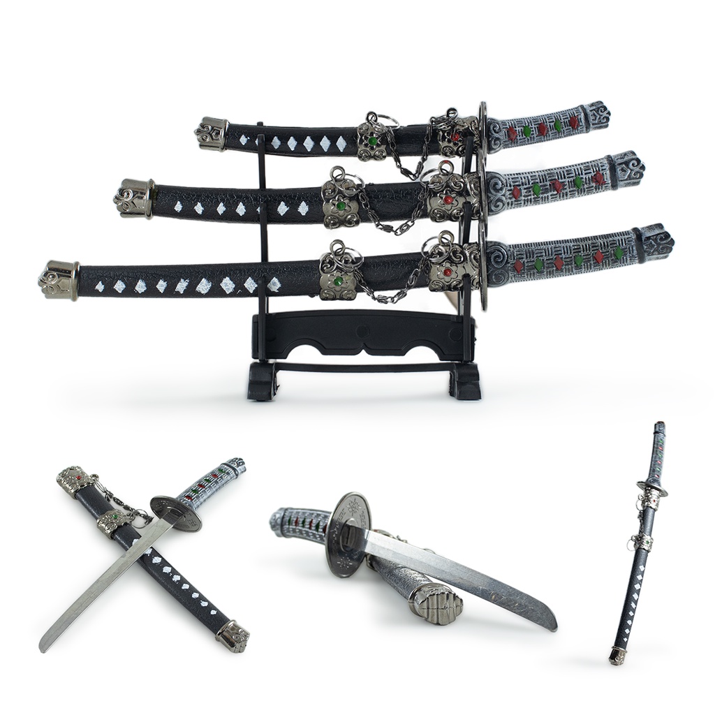 Kit 3 Mini Espadas De Samurai Katana Sabre Para Decoração Temática Em Metal Com Suporte