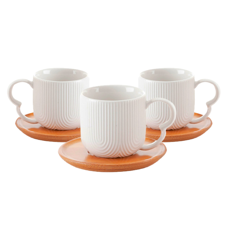 Jogo 4 Xícaras Porcelana Branco De Café Chá Com Pires de Bambu Madeira Oásis 90ml