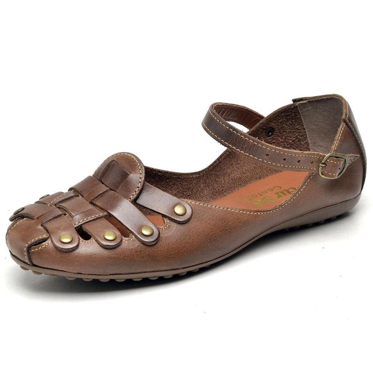 Sandalia Sapatilha Rasteira Fechada Couro Bico Redondo Feminino Confort Fivela Passeio Trabalho