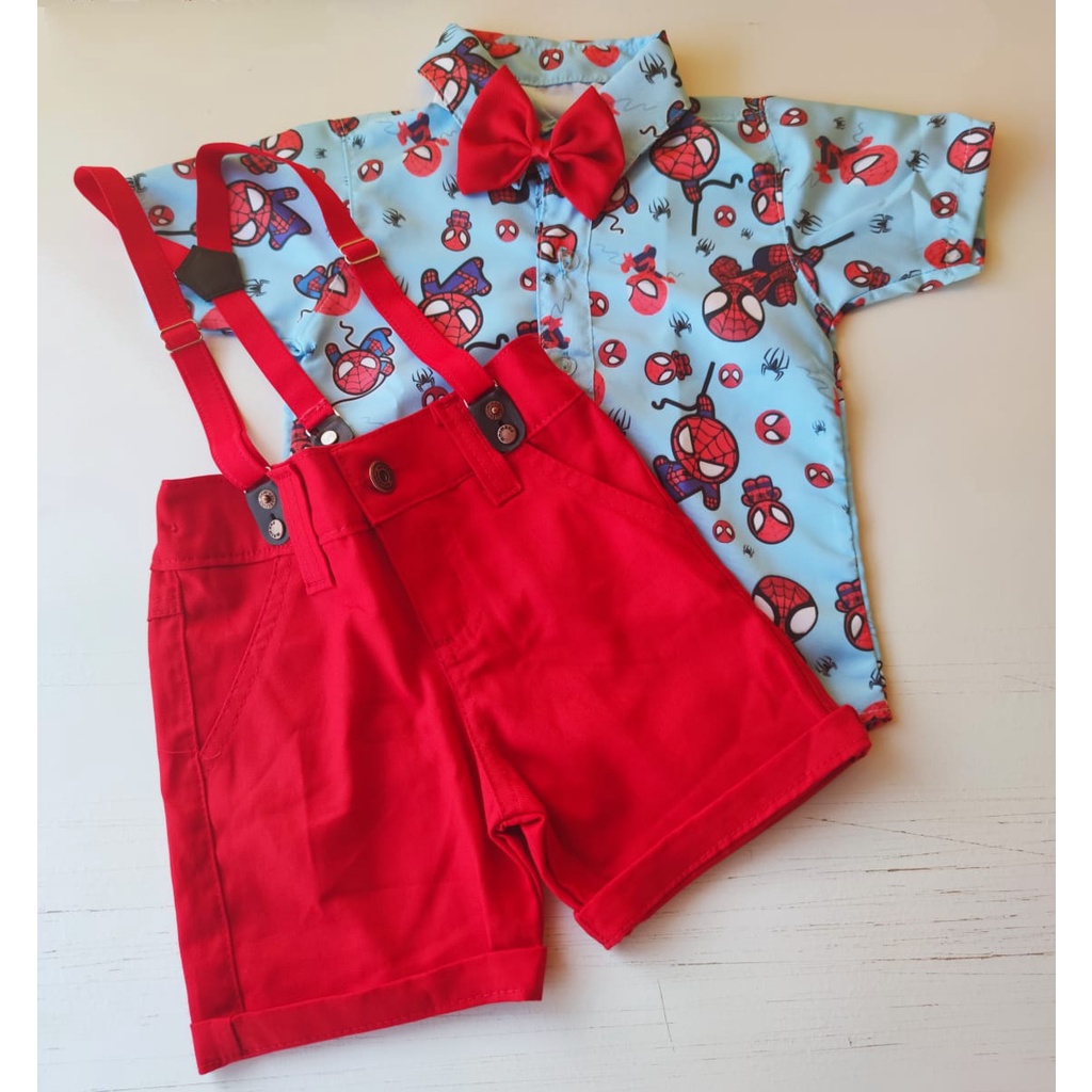 roupa homem aranha festa menino infantil conjunto Camisa Gravata Bermuda e Suspensório