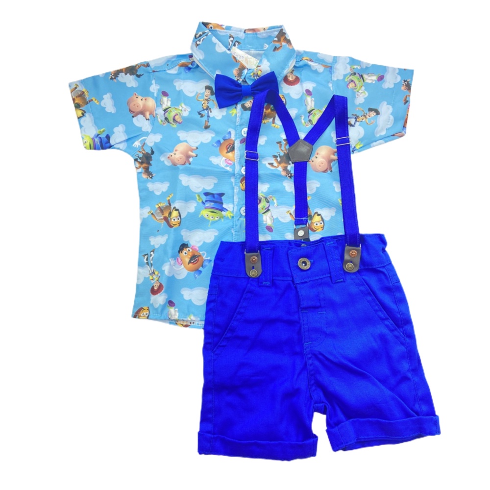 roupa toy story menino infantil festa conjunto Camisa Gravata Bermuda e Suspensório