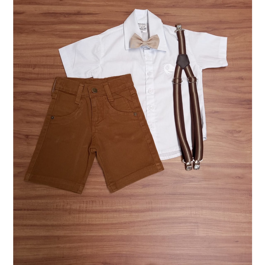 Roupa Menino Infantil Camisa Manga Curta Branco Bordado Branco Bermuda Color Caramelo Suspensório Listrado e Gravata Bege