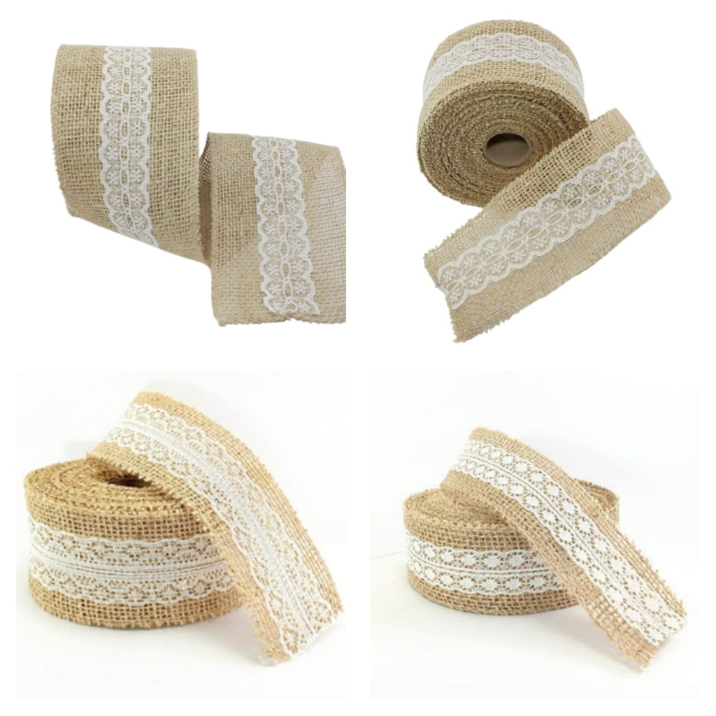 Rolo de fita de juta natural de 10 cm com renda branca de 9,5 m ideal para artesanato , decoração , casamento , rustico e vintage.