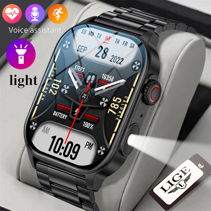 LIGE Novo relógio inteligente original masculino tela HD de 1,96 "com lanterna LED UV 100+ esportes à prova d'água bateria de 420mAh Relógios masculinos Monitor de saúde Mulher Smartwatch para Android e IOS