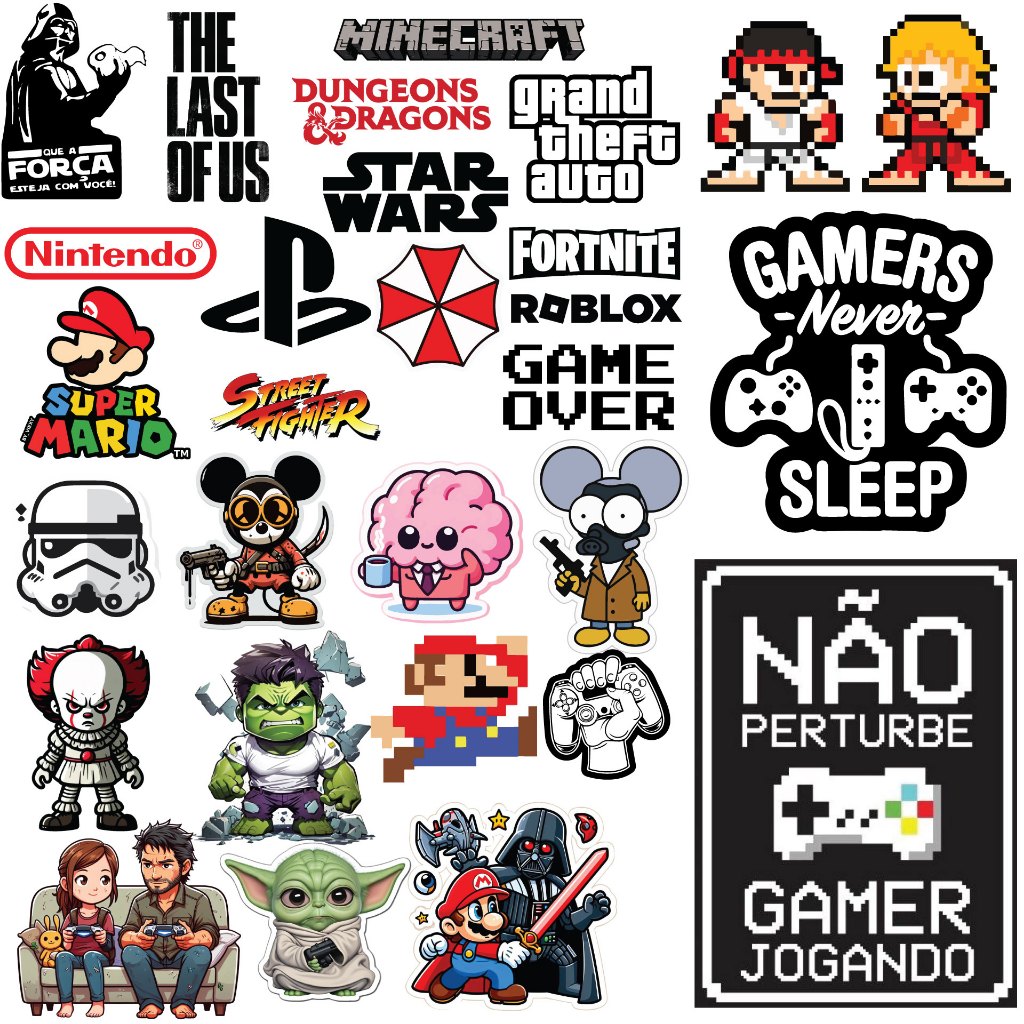 Cartela Adesivo Gamer, Video Game e Nerd 28 adesivos laminado dura 5x mais