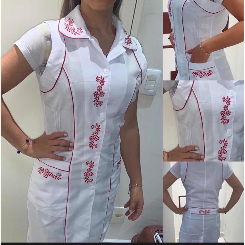 Blusa, Casaco, jaleco feminino acinturados sem manga branco e vermelho bordado..Confortável. Elegante e Durável. ele e perfeito para profissionais da saúde, odontologia, enfermagem, professora.