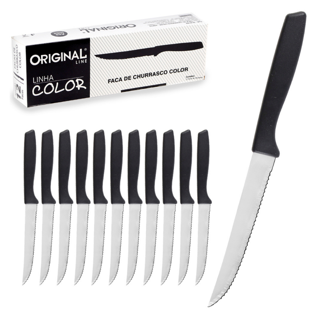 Kit com 12 Faca de Mesa, Churrasco Talher de Aço Inox 22cm com Cabo Colorido Linha Original
