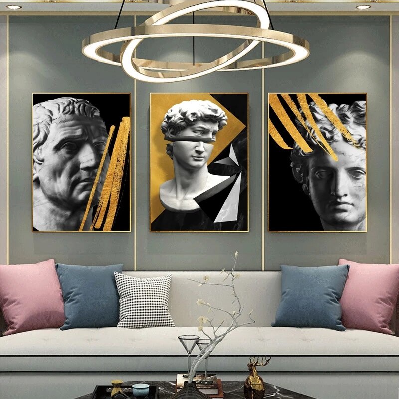 Kit quadro decorativo 3 peças estatuas gregas e geometricos decoração
