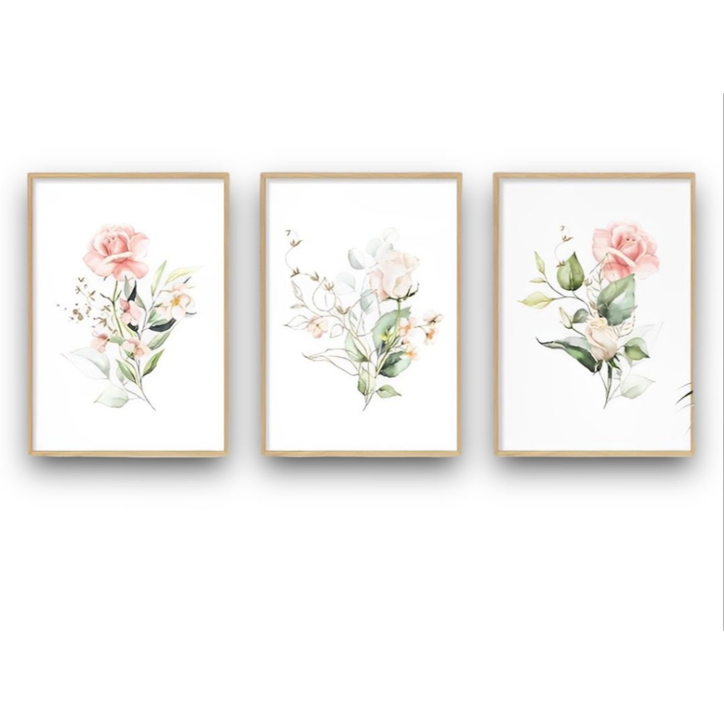 Quadro Decorativo 3 peças 40x60 Flores Rosas Delicadas Minimalista