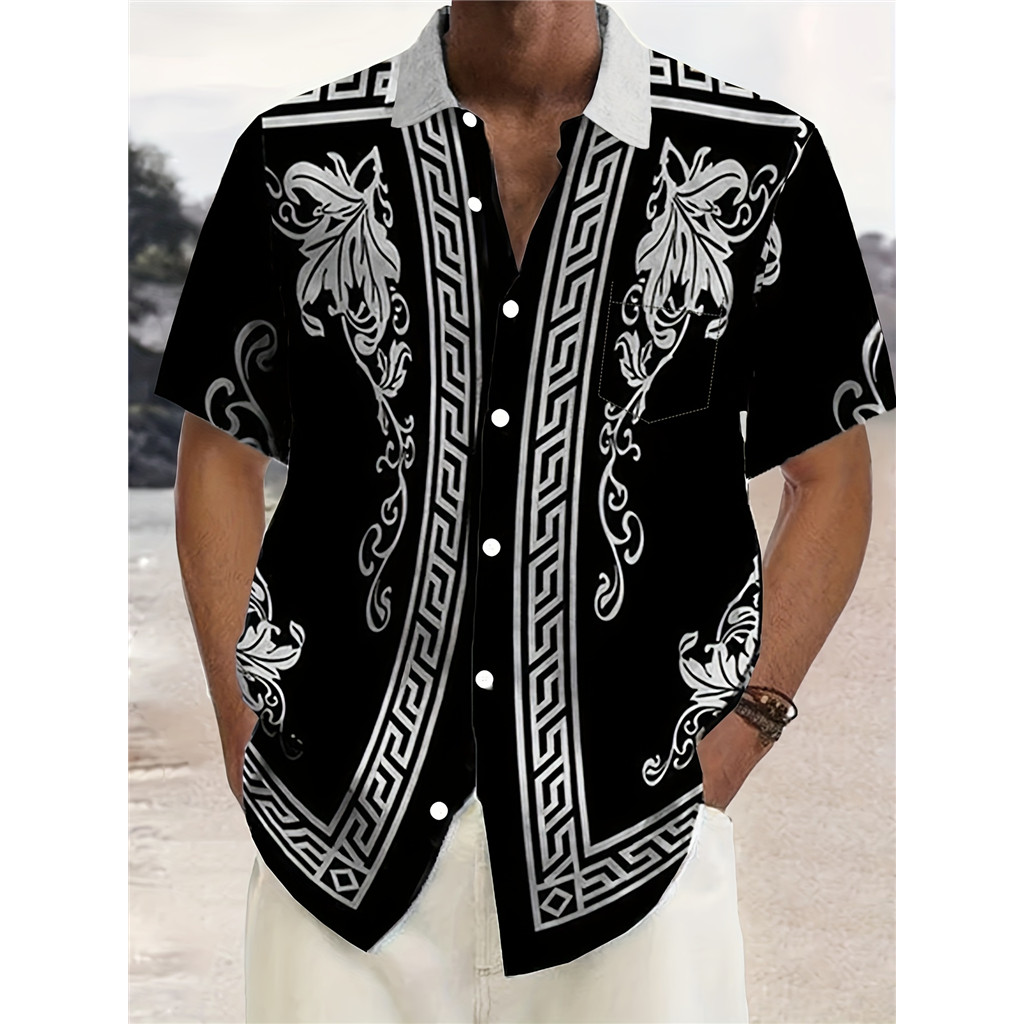 Camisa Masculina De Manga Curta Com Estampa Barroca Plus Size , Floral Vintage E Estilo Tribunal , Botões Bolso , Top Ca