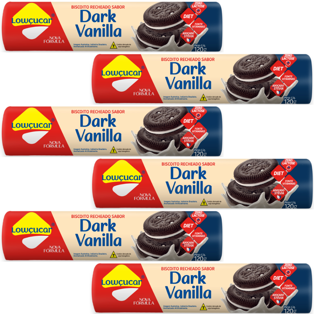 Kit com 6 - Biscoitos Recheados Lowçucar Zero Açúcares, Zero Lactose, Diet, Sabor Dark Vanilla 120g