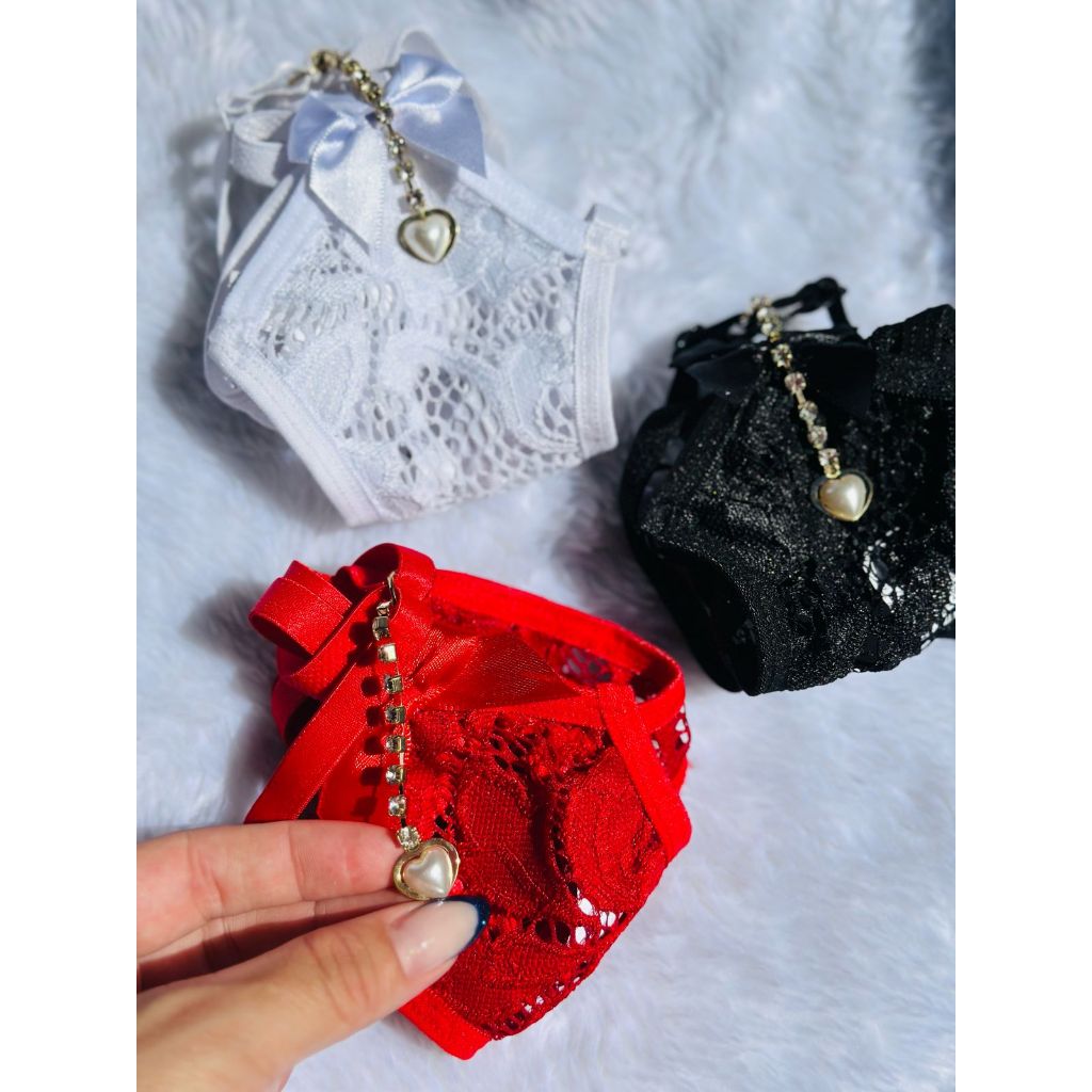 Calcinha Lingerie Sexy Tanga Fio Dental Renda Pingente Coração e Pérolas Moda Íntima Sensual