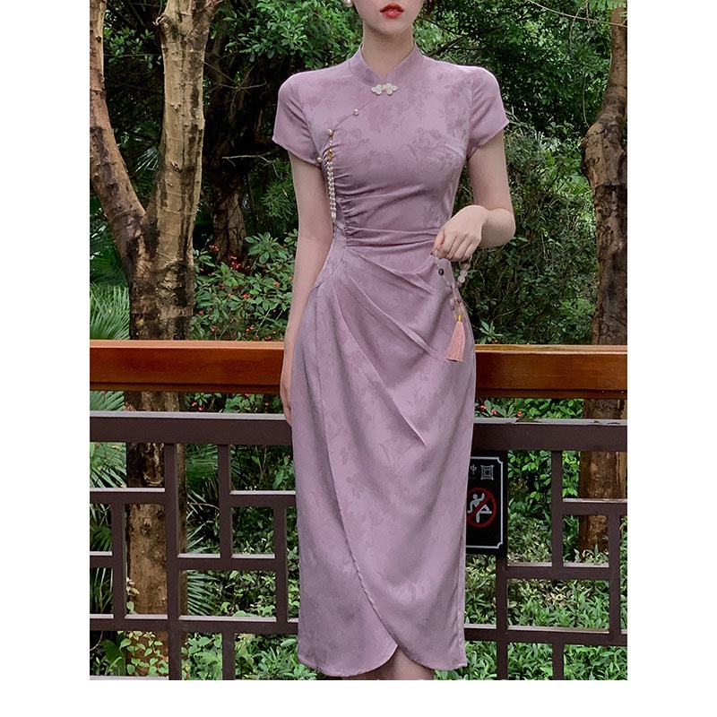 2023 Summer Purple New Chinese Style Cheongsam jacquard Manga Curta Slim Vestido Longo Festa De Casamento Formal S A XXL S2003