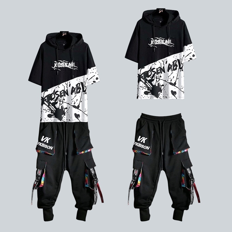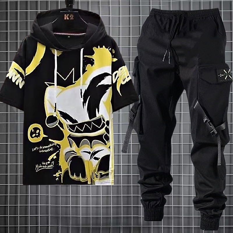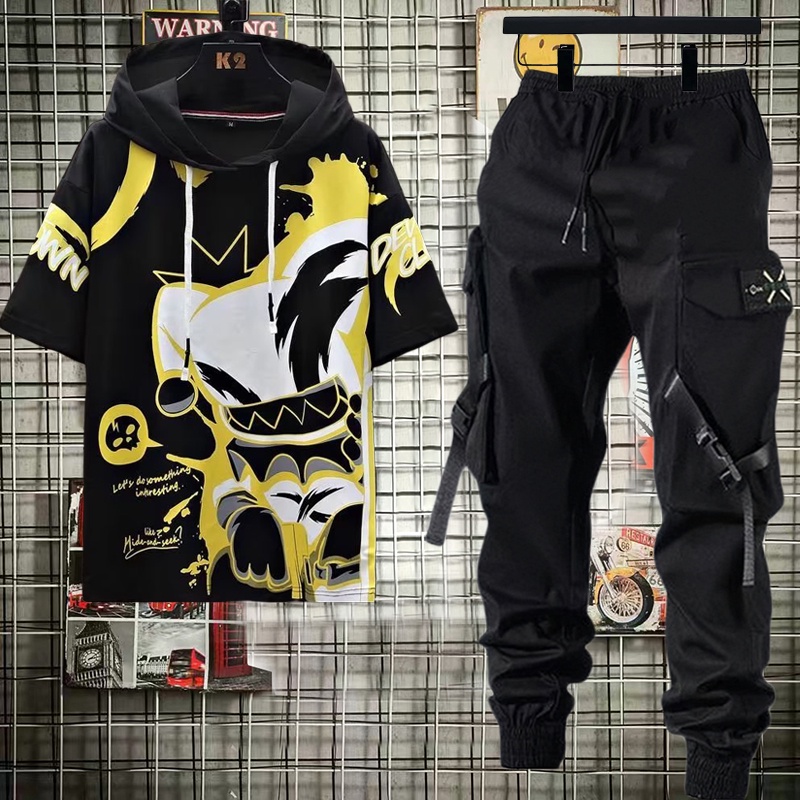 Calças De Carga Masculinas Estilo Hip Hop Joggers + Conjunto De Homens Com Capuzes Casuais Camisetas De Manga Curta Vestuário Masculino De Verão