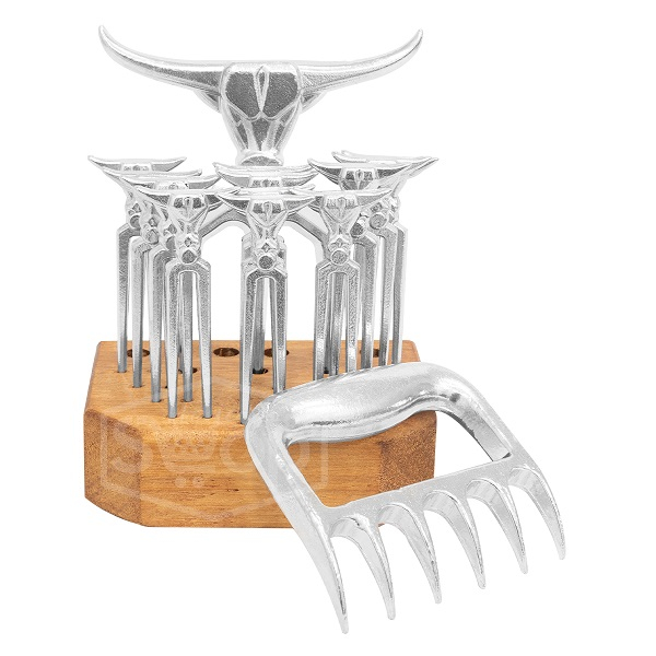 Kit com Garra + Tridente + 12 Garfinhos de Petisco Todos em Alumínio Fundido e Maciços P/churrasco Com Base de Madeira