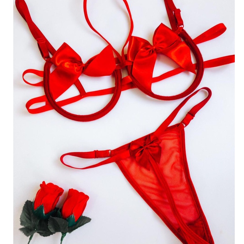 Conjunto de laço sexy lingerie erotica calcinha de renda com abertura na vagina e sutia sem bojo com aro e laço de cetin