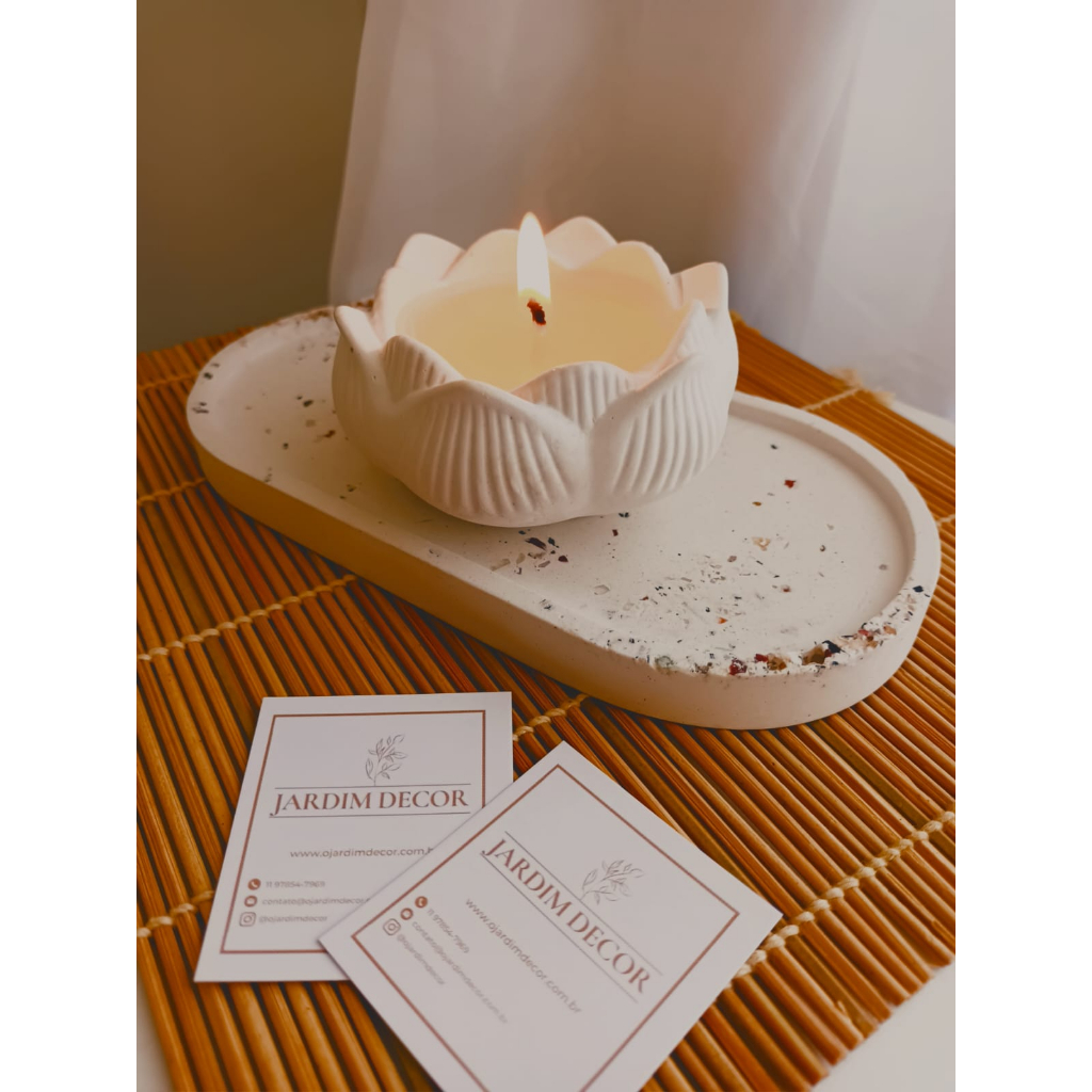 Kit Vela Perfumada Aromática em Flor de Gesso 50 G e Bandeja Decorativa Com Cristais/Bege Marmorizada/Folha de Ouro. Aromas: Lavanda, Maçã & Canela, Rosas ou Vanilla