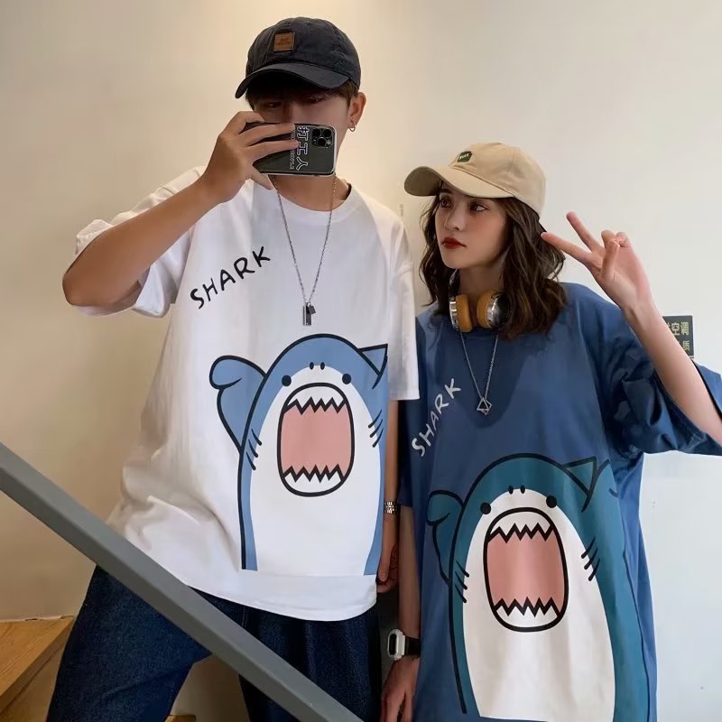 2023 Nova Moda Coreana Tendência top Desenho Animado Pequeno Tubarão Estampado Camiseta Masculina Gola Redonda Manga Curta De hip-hop tops De Rua Ano Novo Casal Preta TEE