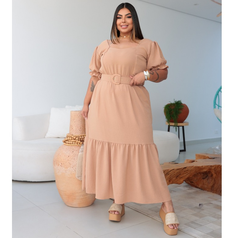 Vestido longo moda feminina tecido duna forrado plus size com cinto