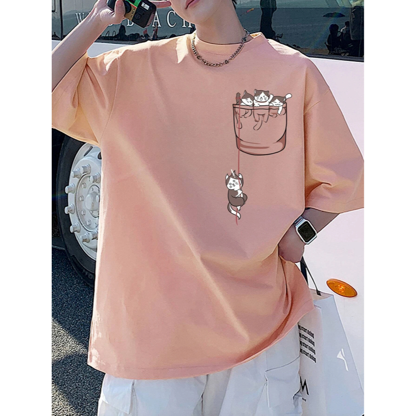 Camiseta Oversized Larga Estampado Bolso Gatos Gatinhos Copo Blusa Manga Curta Ombro Caido Skate Bordado Copo Gato Escalando Old School Tumbrl T-shirt Homem Life Style Sweg Longline Aesthetic Unissex