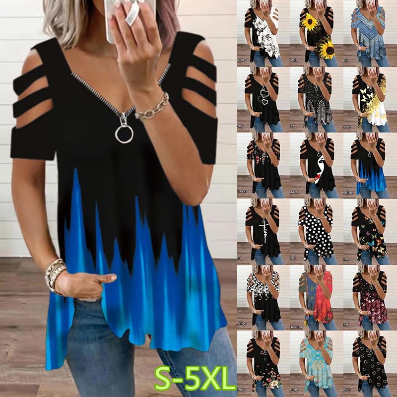 Camiseta Feminina Plus Size De Manga Curta Com Zíper E Decote Em V Estampada P-5xg