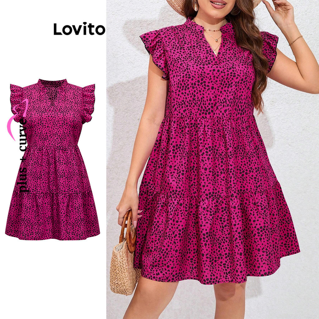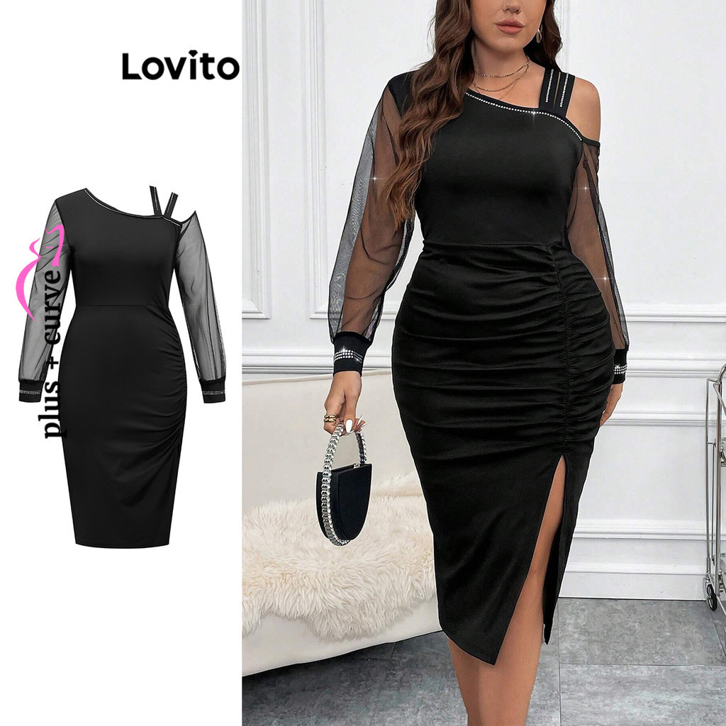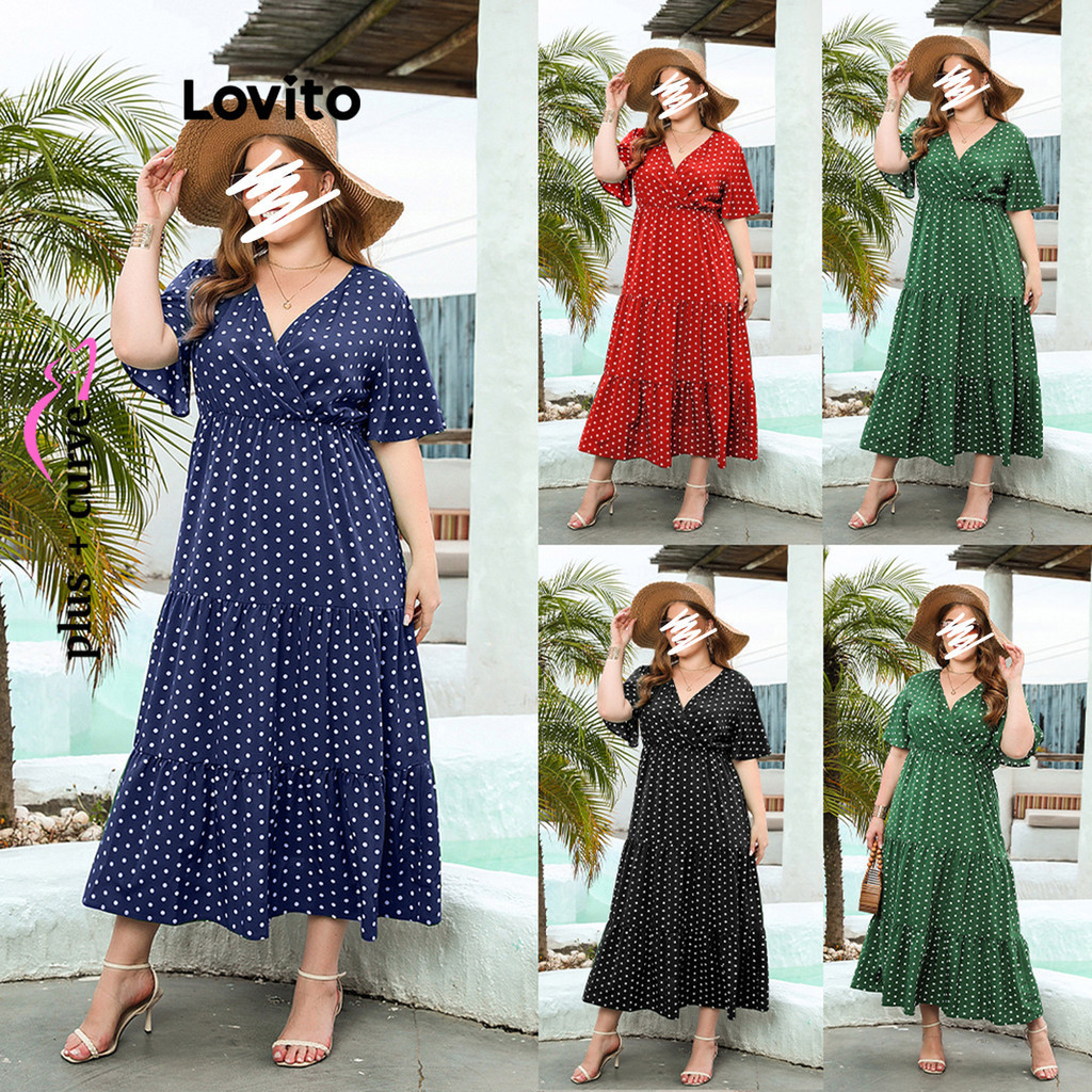 Lovito Vestido Feminino Plus Size Curvo Com Cordão De Bolinhas E Manga Bufante LBE02087 (Preto)