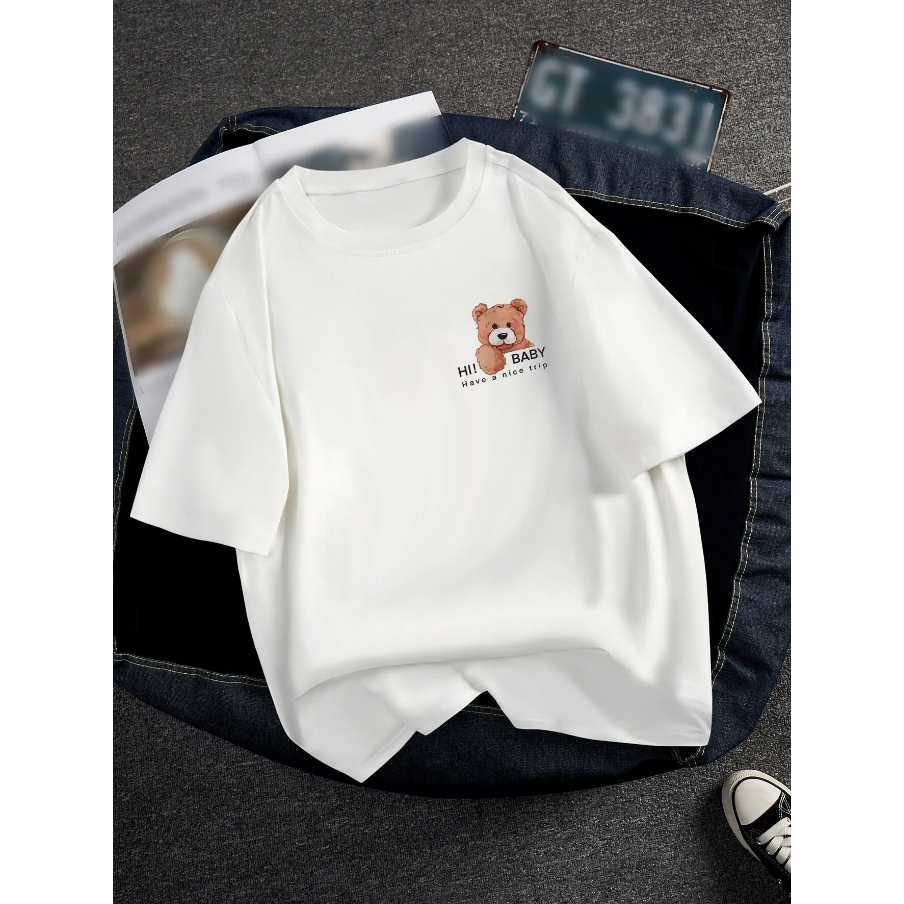 Camiseta Hi! Baby... Estampa Grafica Desenho Ursinho Frase Oi Amor, Tenha Uma Boa Viagem T-shir Larga Manga Curta Ombro Caido Unissex Oversized